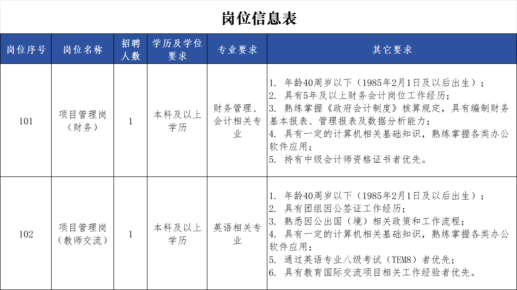4、符合《岗位信息表》中岗位要求的资格条件。有工作经历要求的,工作经历计算的截止日期为2025年2月12日。