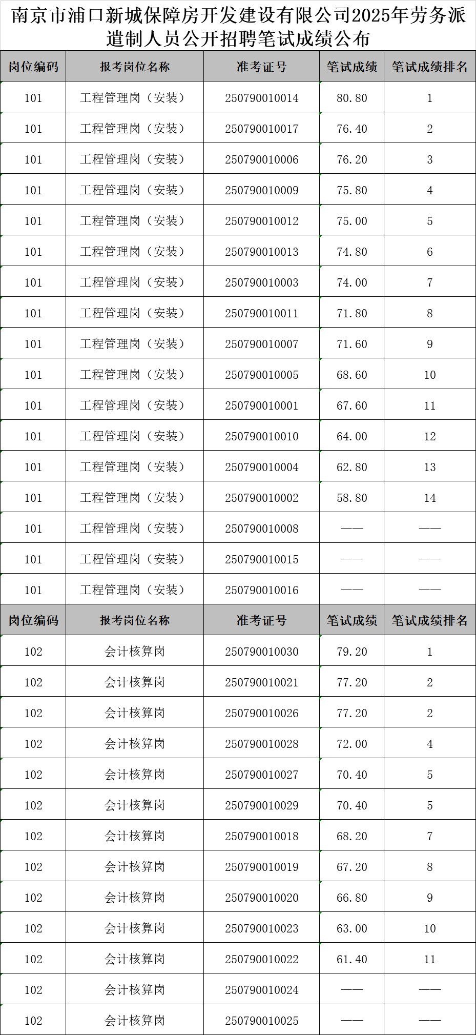 南京市浦口新城保障房开发建设有限公司2025年劳务派遣制人员公开招聘笔试成绩公布